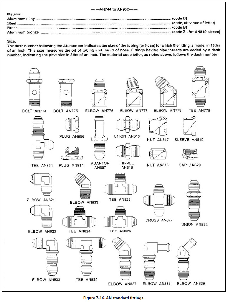 at the edge of the flare, and distributes the shearing action over a wider area for added strength. Fitting combinations composed of different alloys should be avoided to prevent dissimilar metal corrosion. As with all fitting combinations, ease of assembly, alignment, and proper lubrication should be assured when tightening fittings during installation. Standard AN fittings are identified by their black or blue color. All AN steel fittings are colored black, all AN aluminum fittings are colored blue, and aluminum bronze fittings are cadmium plated and natural in appearance. A sampling of AN fittings is shown in Figure 7-16. Table 7-2 contains additional information on sizes, torques, and bend radii.
