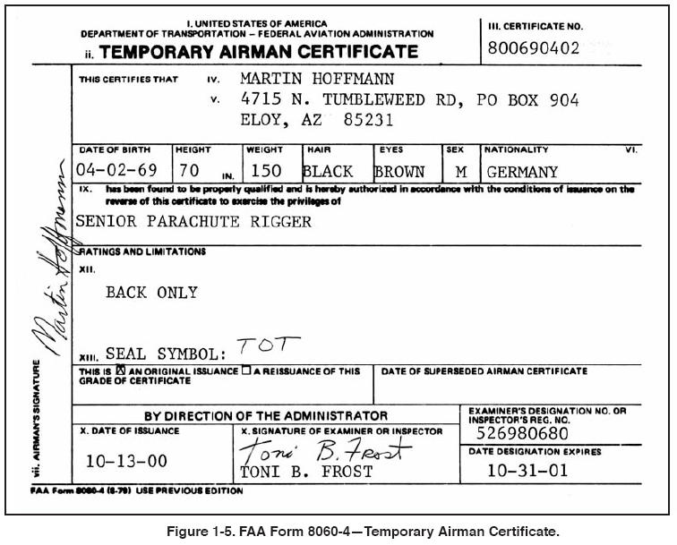parachute rigger certificate [Figure 1-5 on page 1-5] and