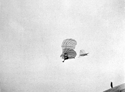 The energetic effect of the change of the centre of gravity and the safe starting of the apparatus obtained by it gave me courage to trust myself to a wind which at times exceeded a velocity of 10 metres (about 24 miles per hour). This gave the most interesting results of all my practical flying experiments hitherto. Six or seven metres velocity of wind sufficed to enable the sailing surface of 18 square metres to carry me almost horizontally against the wind from the top of my hill without any starting jump. If the wind is stronger, I allow myself to be simply lifted from the point of the hill and to sail slowly towards the wind. The direction of the flight has, with strong wind, a strong upward tendency. I often reach positions in the air which are much higher than my starting-point. At the climax of such a line of flight I sometimes come to a standstill for some time, so that I am enabled while floating to speak with the gentlemen who wish to photograph me, regarding the best position for the photographing.6